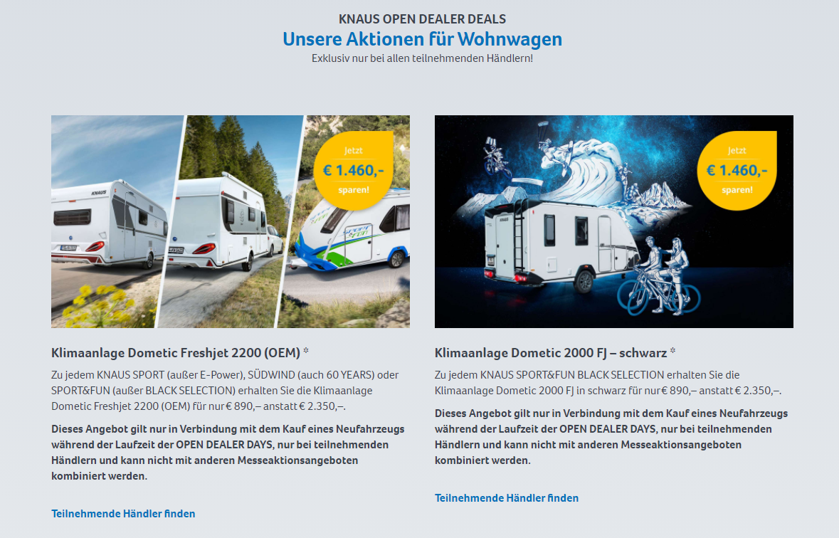 Von 2 Personen- bis Familien-Wohnwagen mit Kajüten haben wir vieles auf Platz. Bei KNAUS finden Sie Freizeitfahrzeuge, die genau zu Ihren Wünschen passen. Wir beraten Sie gerne – vor Ort – und präsentieren Ihnen attraktive Angebote, die Sie exklusiv während der OPEN DEALER DAYS erhalten. Das sollten Sie nicht verpassen!