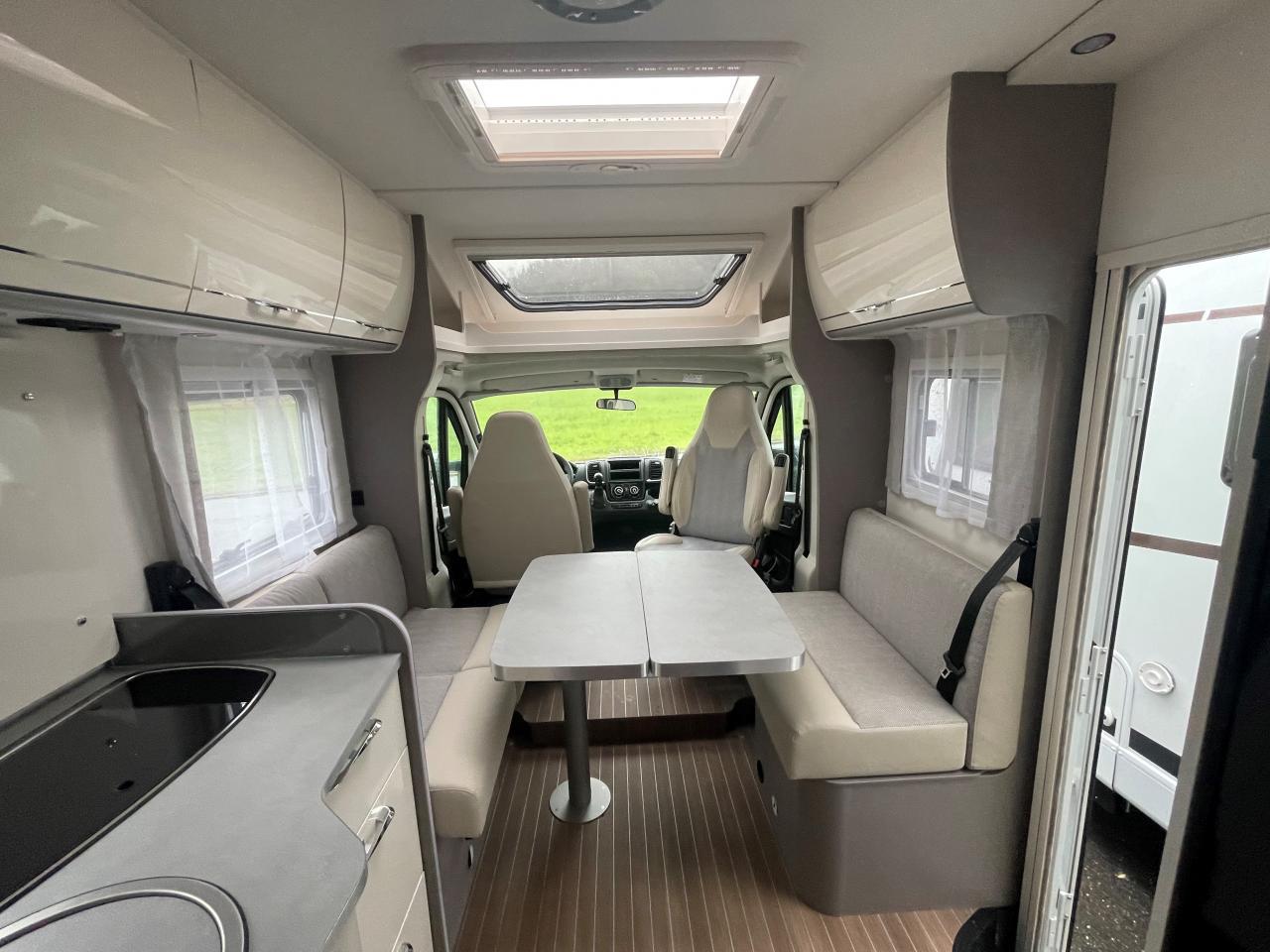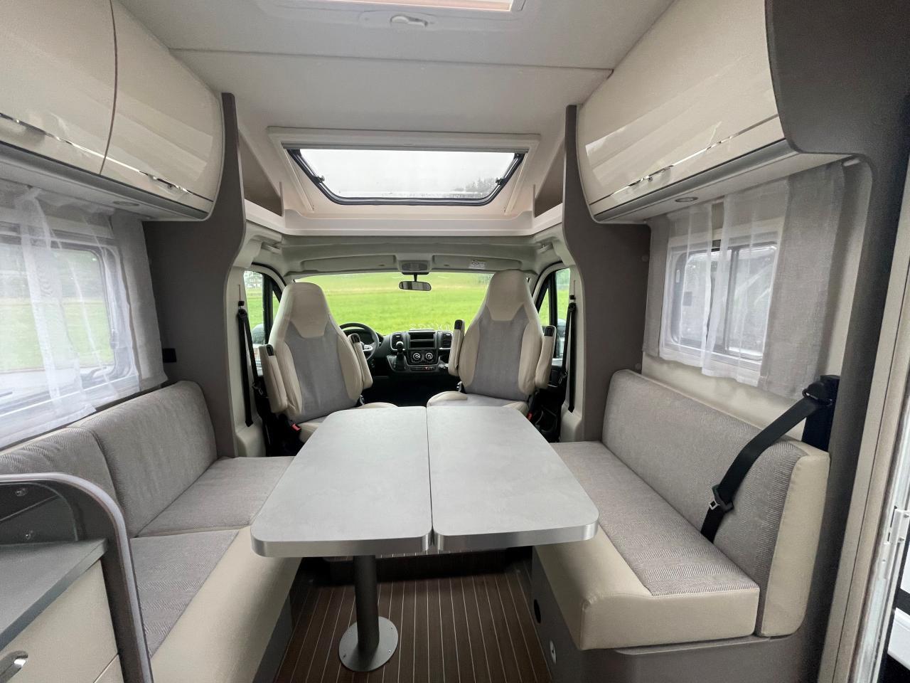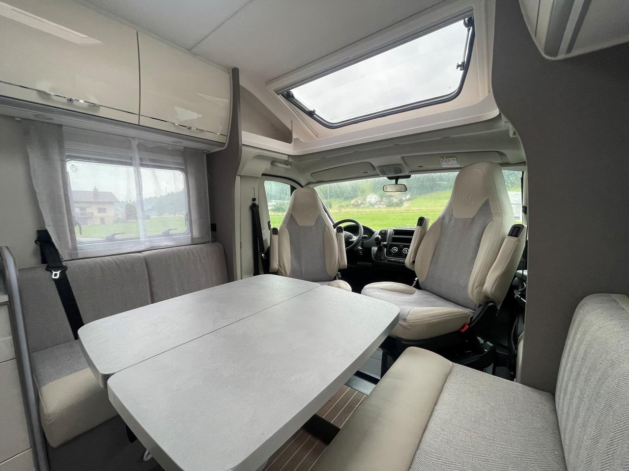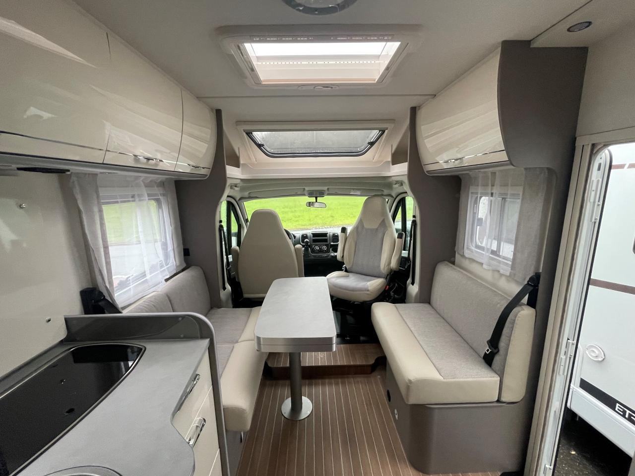 Flexibel und wendig unterwegs sein. Mit dem richtigen Reisemobil ist alles möglich: Von Familien-Urlaub bis City-Trip zu zweit. Design-Update und Komfort-Extras bei den Teilintegrierten von Etrusco: Noch bequemer, noch durchdachter und noch mehr Wohlfühlen. Für spannende Tage und entspannte Nächte. Mit dem T 7400 SBC gehen wir neue Wege in der Wohnraum und Sitzgruppen-Gestaltung. Zwei gegenüberliegende Sofas bilden gemeinsam mit den Fahrerhaussitzen und einem funktionalen Esstisch den grosszügigen Wohnraum. Hinter dem Raumbad und der separaten Dusche findet sich eine praktische Trennwand wieder, die Wohn- und Schlafbereich voneinander abtrennen lässt. Complete Selection: