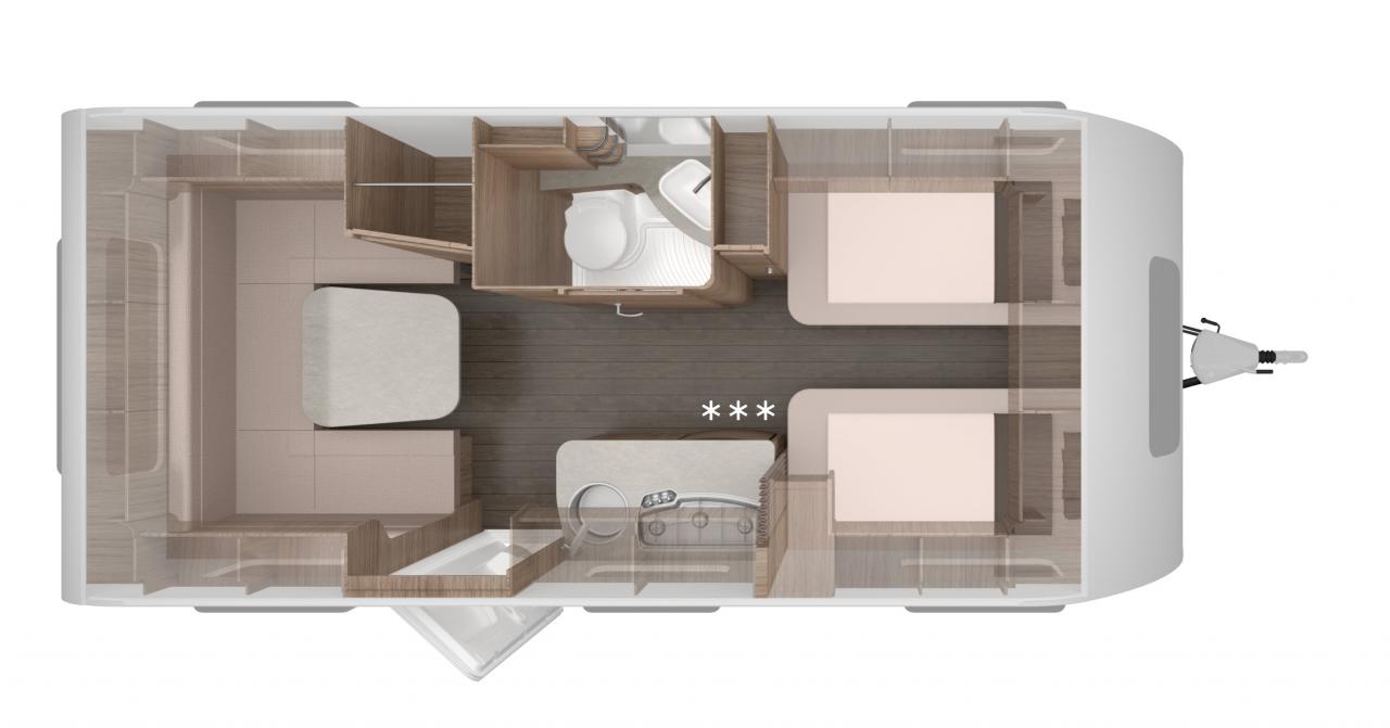 Komfortabler Wohnwagen mit Einzelbetten, U-Sitzgruppe