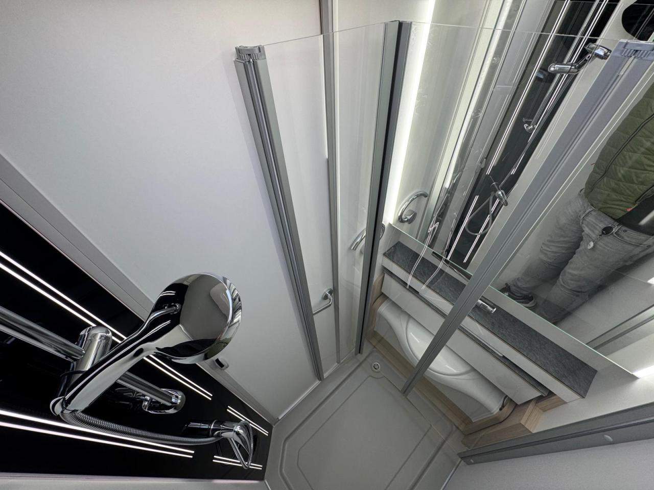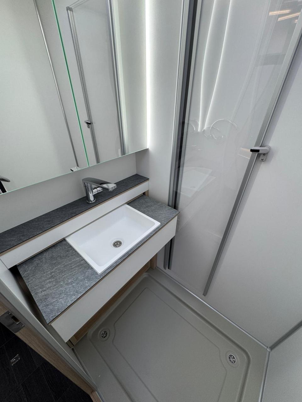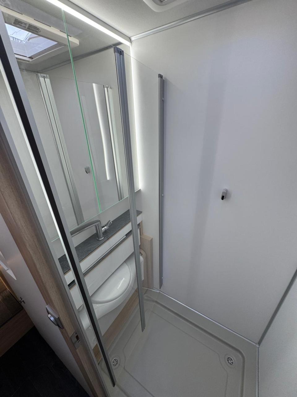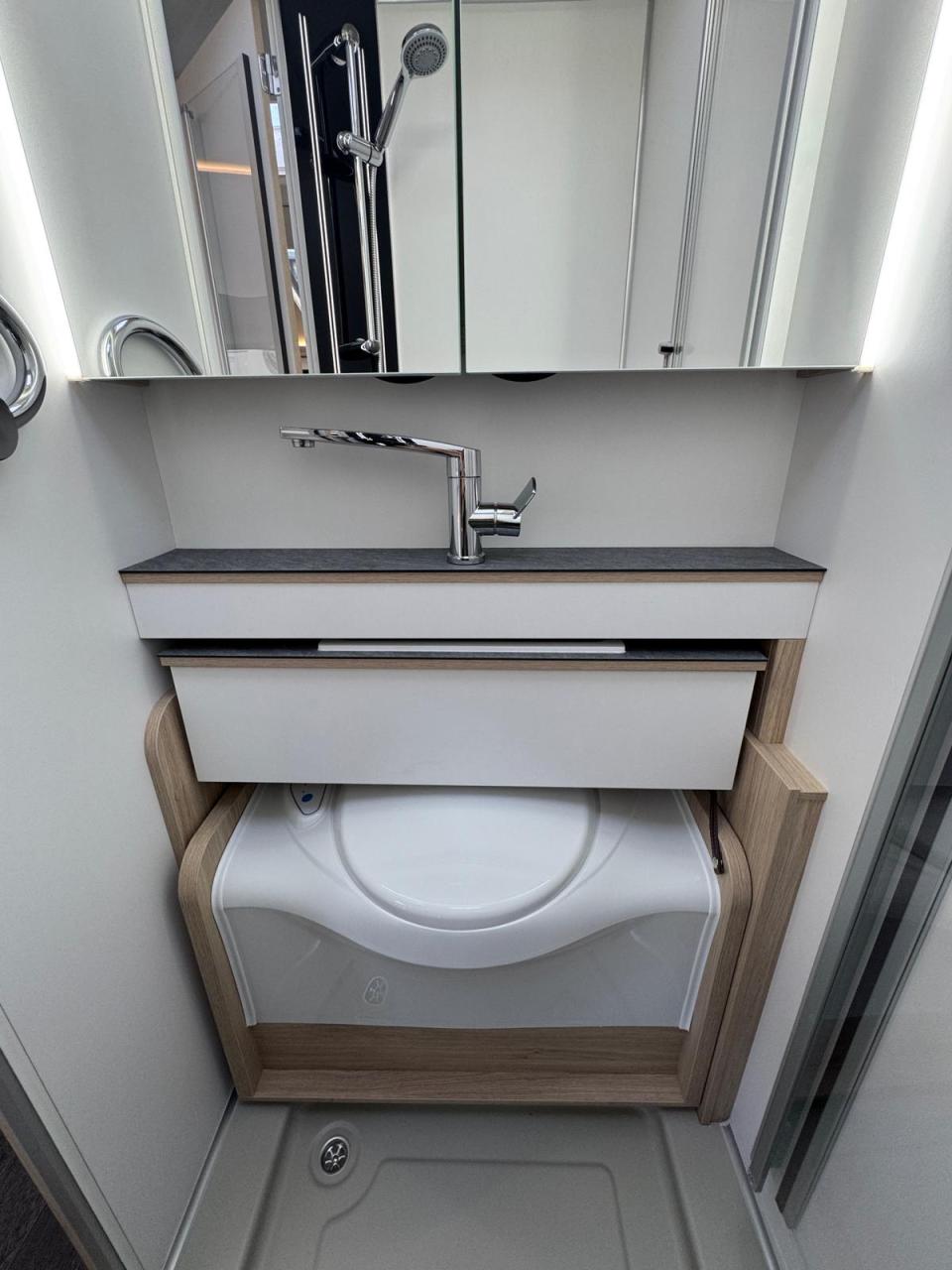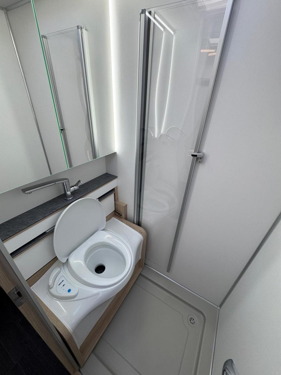 großzügiger Waschraum inkl. durch Gasdruckfedern verschiebbare Banktoilette